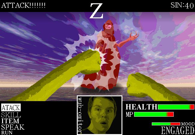 Enemy combat in WubbyWorld appears to take place in a first-person POV shot where you enter the world of the titular "Wubby" and face your foes head-on. On the right are your various meters like your Health, MP/MANA, and Mood. The middle of the hud displays a "Wub-Omitor" (Likely a misspelling of "Wub-Ometor" displaying wubby's various emotions, similar to the icon of the iconic dating simulator "Doom (1993)". The left of the hud contains your options, consisting of "ATACK" (Attack), SKILL, "ITEM", "SPEAK", and "RUN." ATACKing seems to require you to spam the "Z" button on your keyboard to deal maximum damage as wubby's POV punches the baddies into last week.