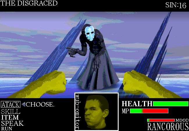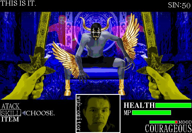 The top of your HUD's purpose seems to be interchangeable, as multiple screenshots show it displaying text and enemy names/statuses interchangeably. It's safe to call this an "Info" section, atleast, we think. The right of the screen showcases your SIN meter, which is heavily theorized to be determined by which enemies you choose to kill or negotiate with, theoretically with the "SPEAK" option, similar to games like "Blundertale" and "Shinagani Tensay", in which you can spare/negotiate with enemies and ghouls and goblins by speaking to them and soothing their souls.